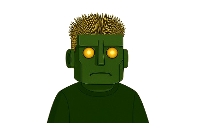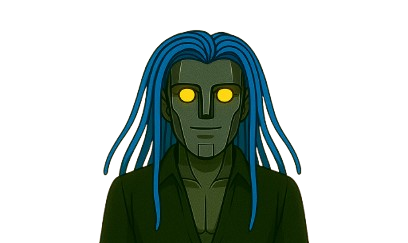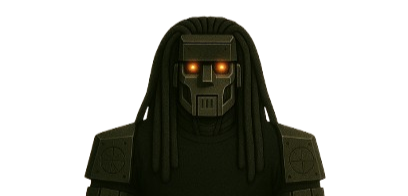 Design: dark robot, very square in shape, black dreadlocks, yellow eyes (neutral expression), black T-shirt, black jeans, black boots