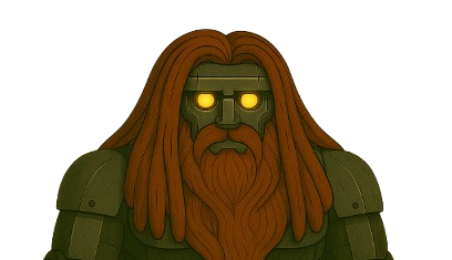 Design: giant robot, very imposing, very long red cable hair, massive beard, torn brown shorts, hybrid metal/red “cable hair” torso.