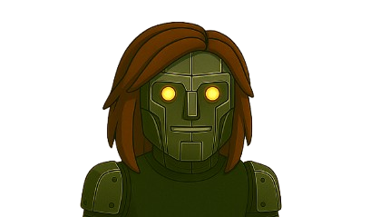 Design: angular metallic face, soft yellow eyes (neutral expression), long brown cable hair, dark T-shirt, jeans, metallic boots
